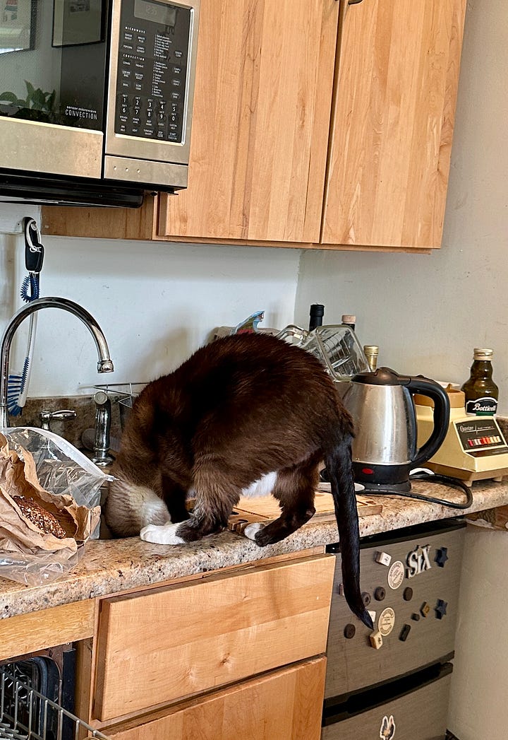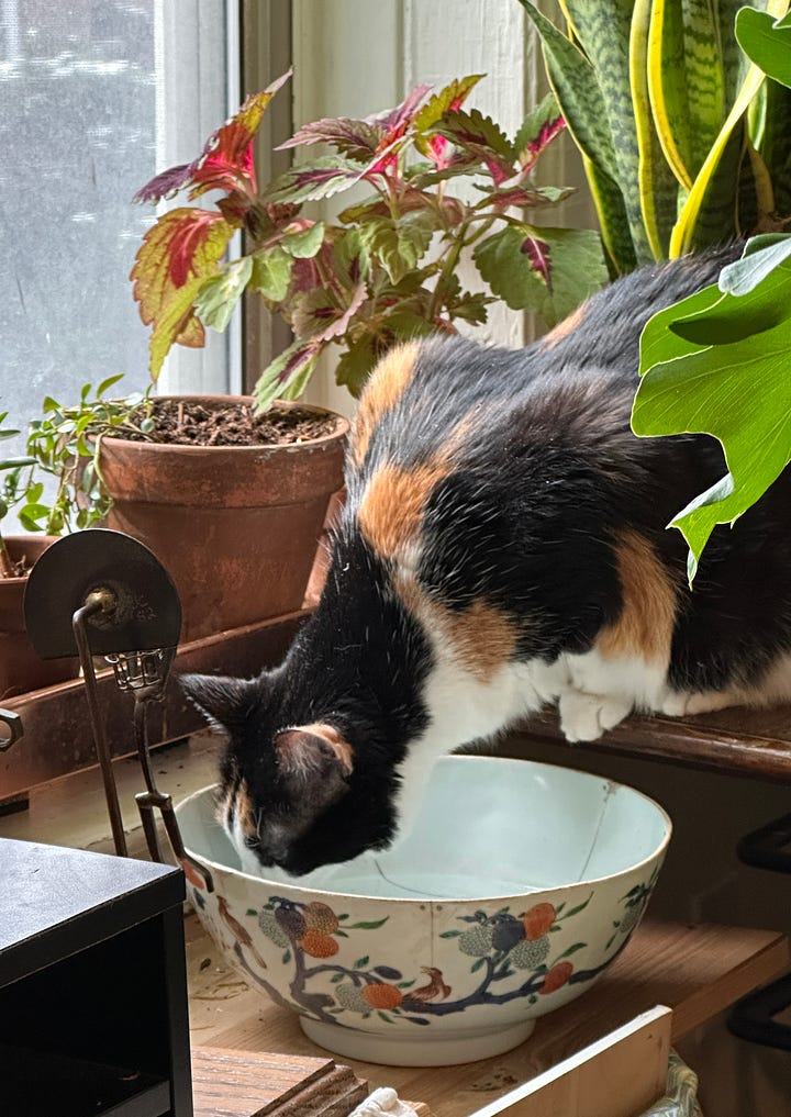 Top left: Petra drinking from the bowl that SJ keeps by the window for the plants. Sure we have a water bowl by our food dishes, but this isn’t ours so it tastes much better. I drink there too, and SJ says so did Bella and the late great Fugazy.