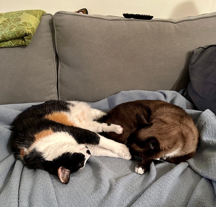 We’re very happy here at SJ’s. We have toys and soft places to sleep and Petra is starting to make biscuits in SJ’s lap, though she does it standing up. She’s not ready to curl up there yet. I’m not a lap kind of cat but I glue myself to SJ’s side when she’s on the couch, especially when she’s watching the Knicks.