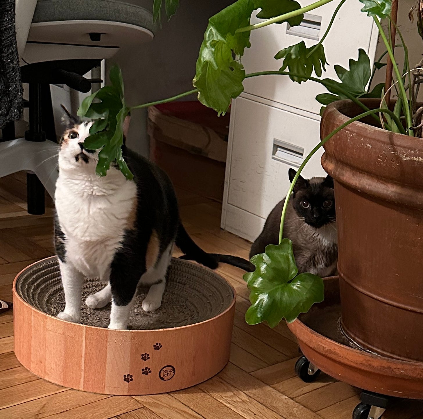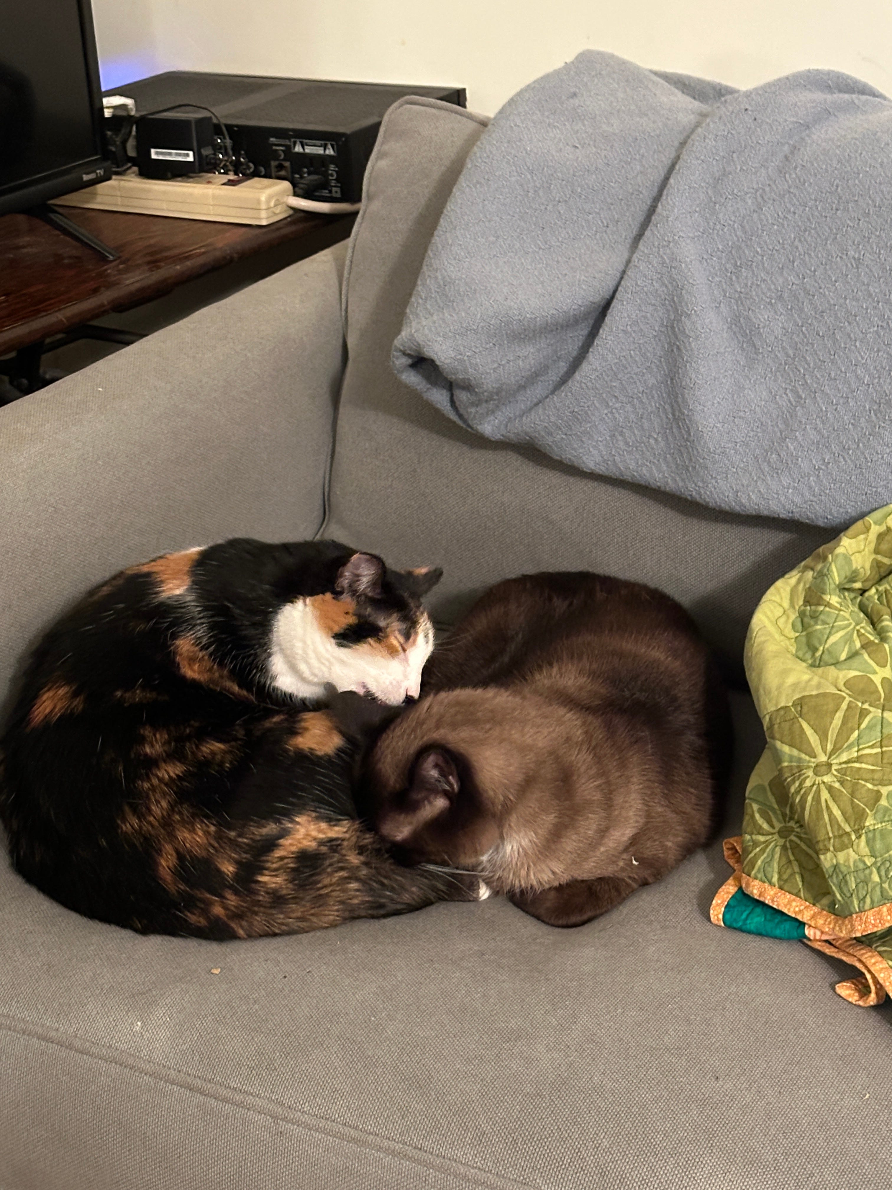 So as the new year approaches, I want to offer you all a handhold, and show you what I did to seal the deal with the future. Many of you knew, even if only electronically, my cat Bella, who died two years ago. I’ve been a catless Childless Cat Lady ever since. Well, the same vet practice who found me Bella has found me these two. Petra and Mo. Ten years old, together since they were kittens, living at the vet as allergy refugees until they found a new home.
